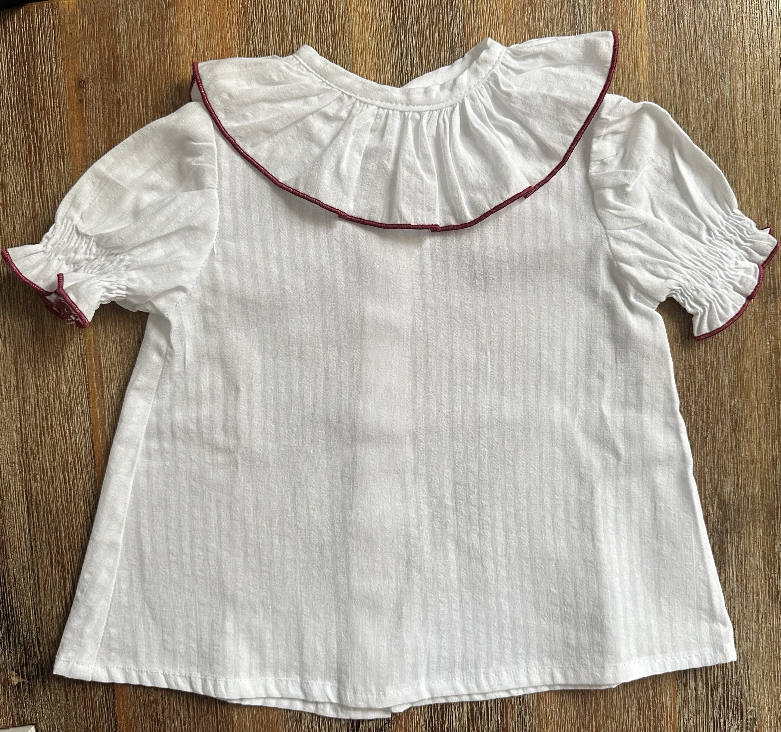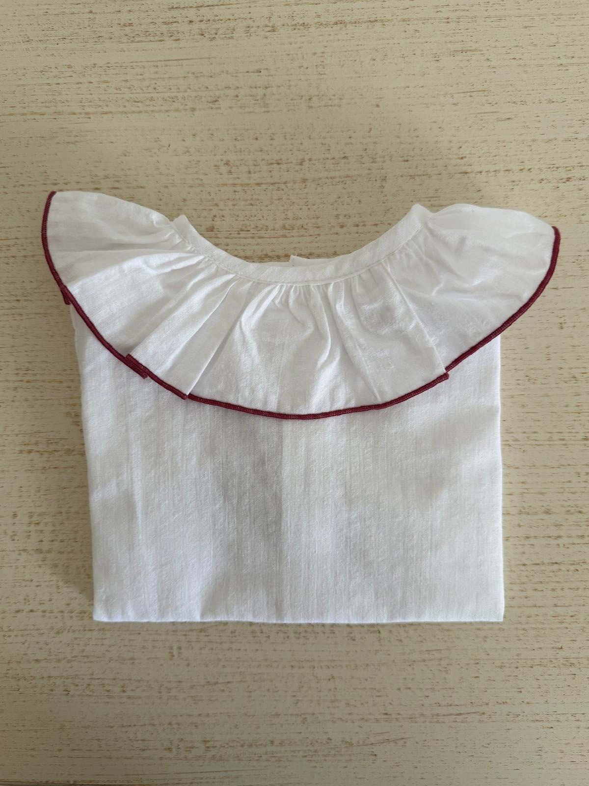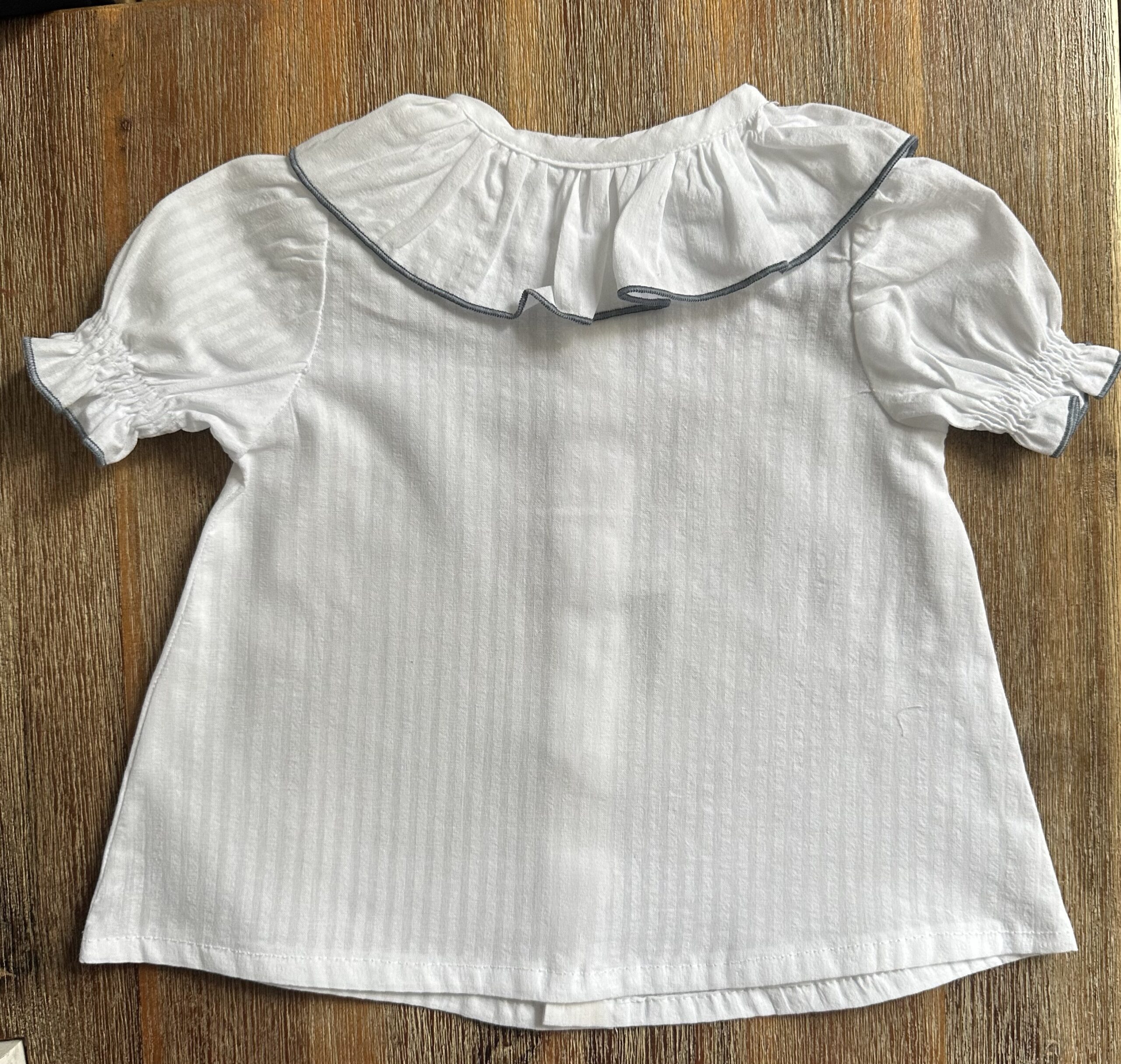 Blusa blanca 100% algodón con cuello de volante y manga corta. El volante lleva ribete de color fresa o color gris claro, al igual que en el filo de la manga. Ambas son super combinables y un básico para esta temporada de primavera verano.