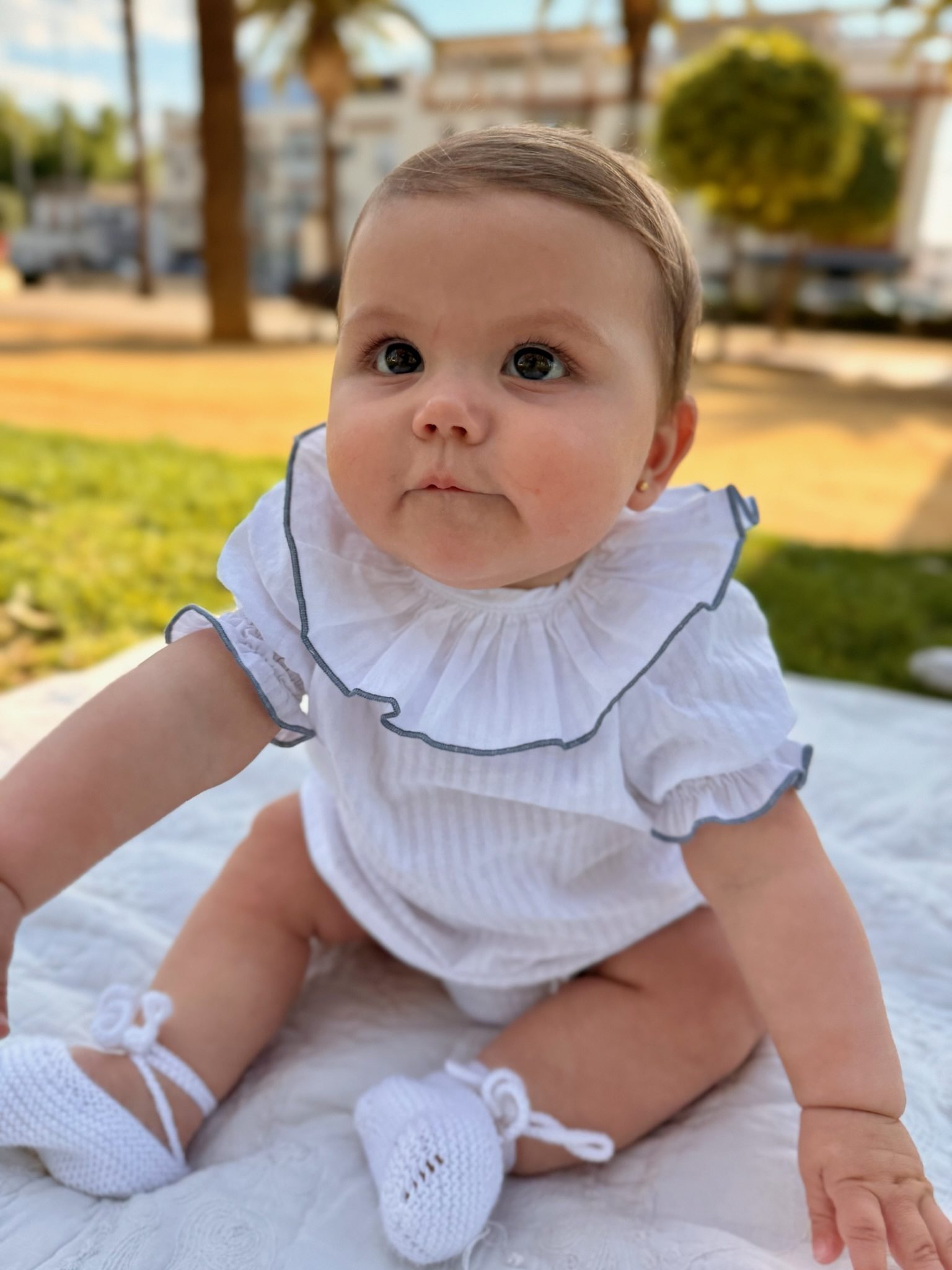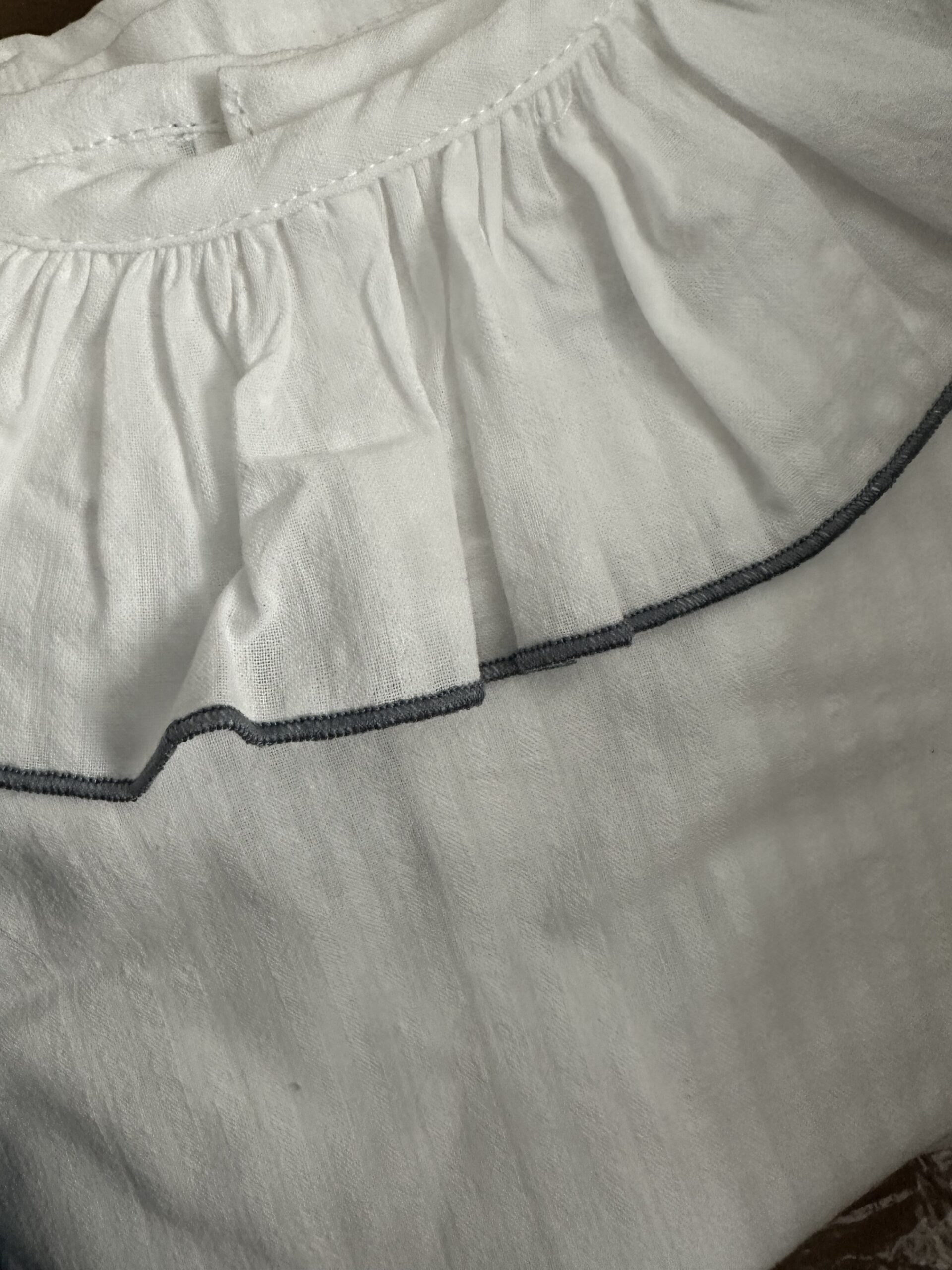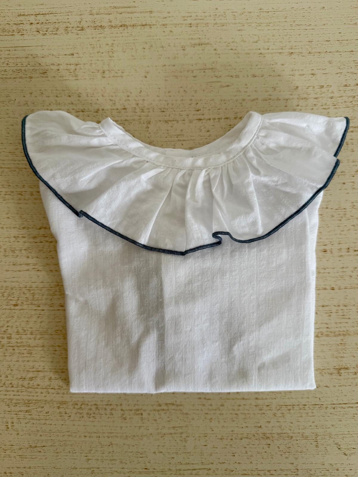 Blusa blanca 100% algodón con cuello de volante y manga corta. El volante lleva ribete de color fresa o color gris claro, al igual que en el filo de la manga. Ambas son super combinables y un básico para esta temporada de primavera verano.