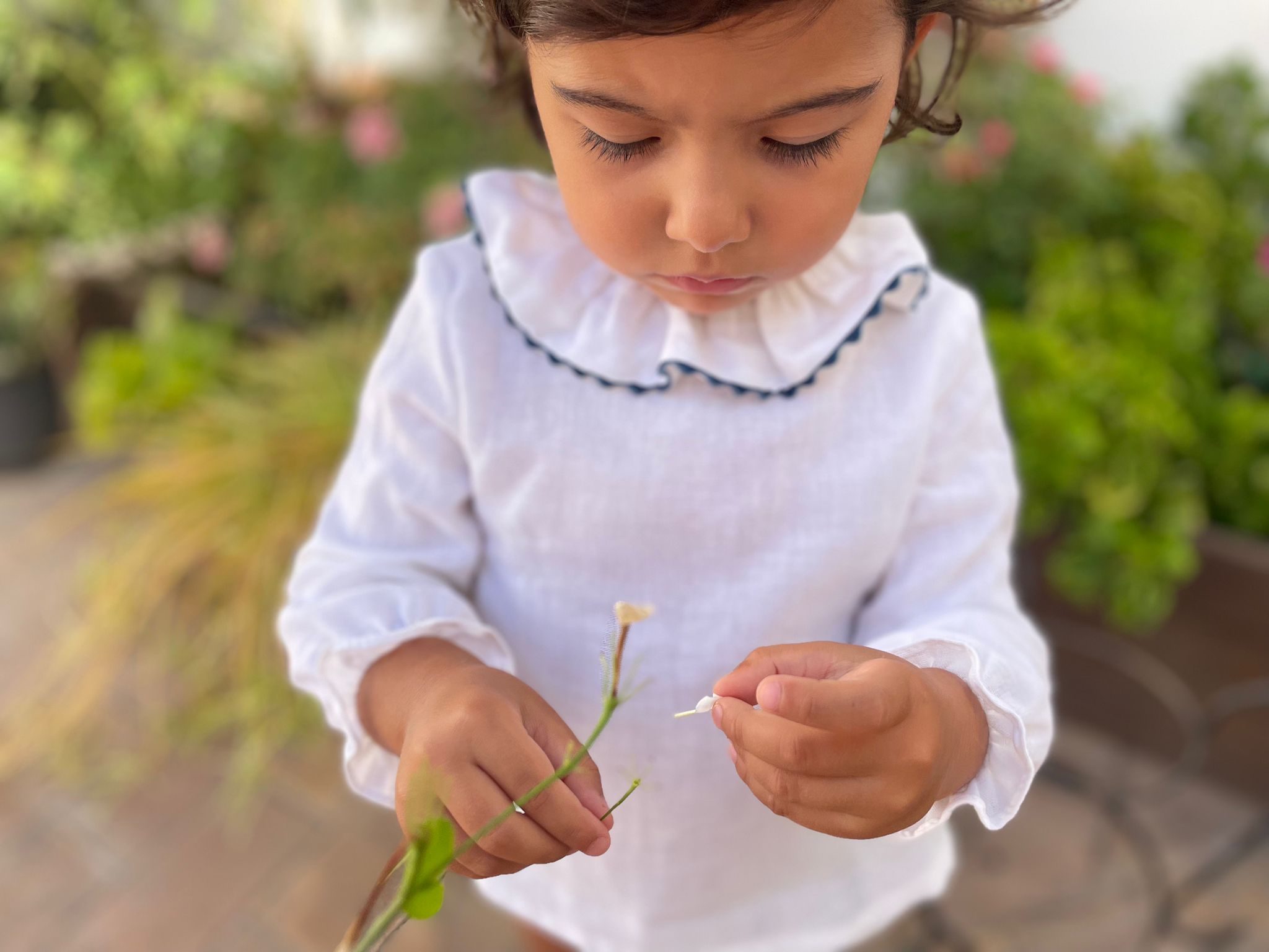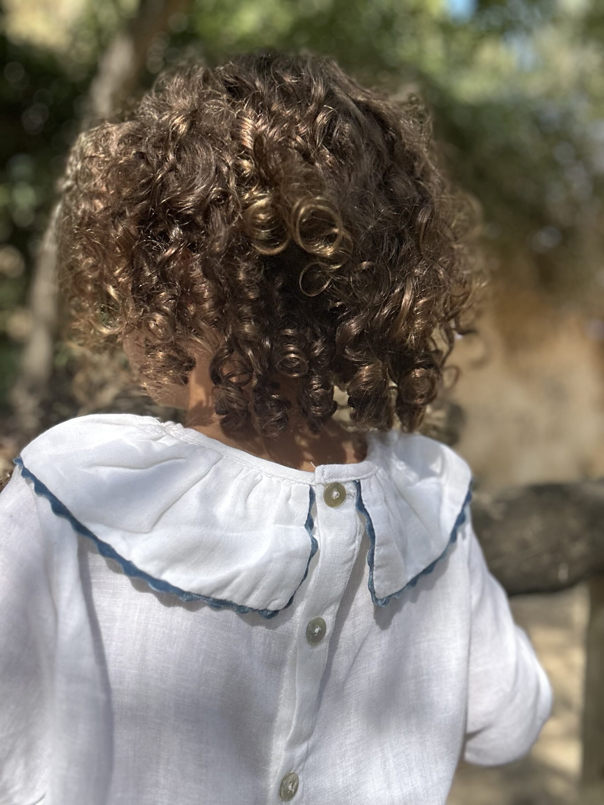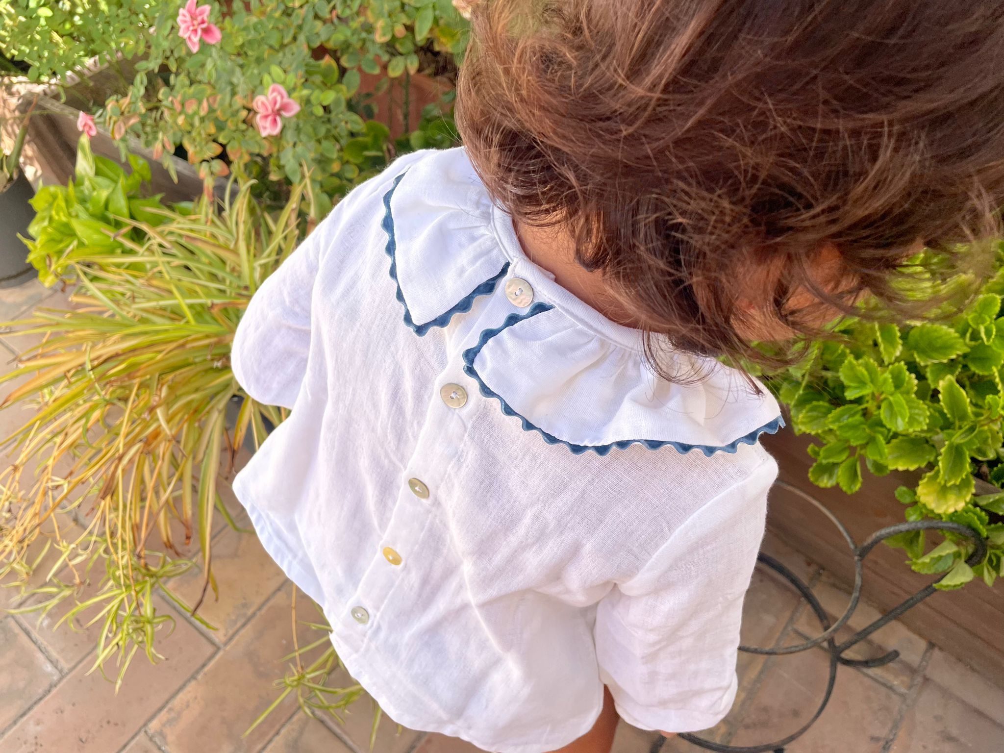 Esta blusa está confeccionada en un suave tejido de doble gasa, ideal para la delicada piel de los más pequeños. Su diseño incluye un cuello con un elegante detalle de ondulina de terciopelo azul, que añade un toque de distinción y estilo clásico. La blusa velvet ondas cuenta con botones en la parte posterior, facilitando su colocación y ajuste. Perfecta para ocasiones especiales o para un look casual chic, esta prenda es un imprescindible en el armario de cualquier pequeño con estilo.
