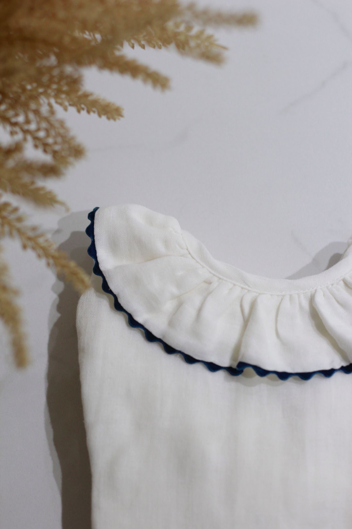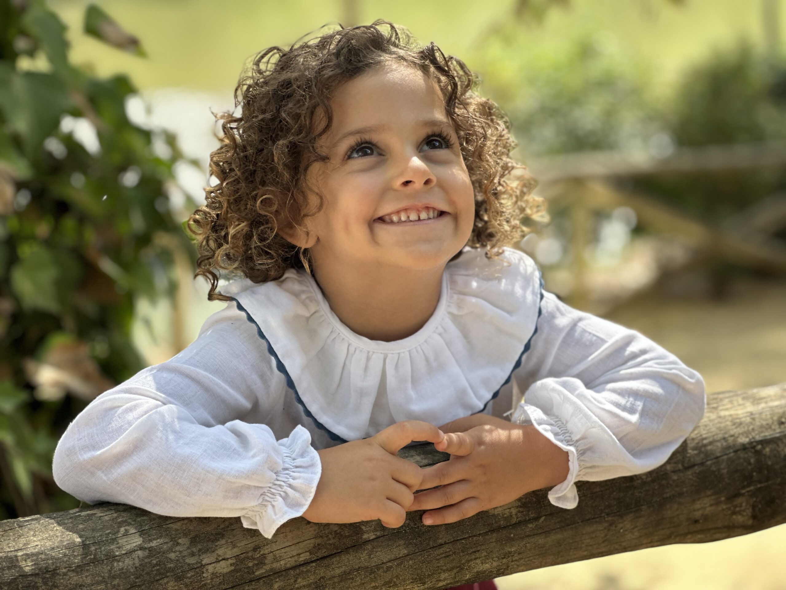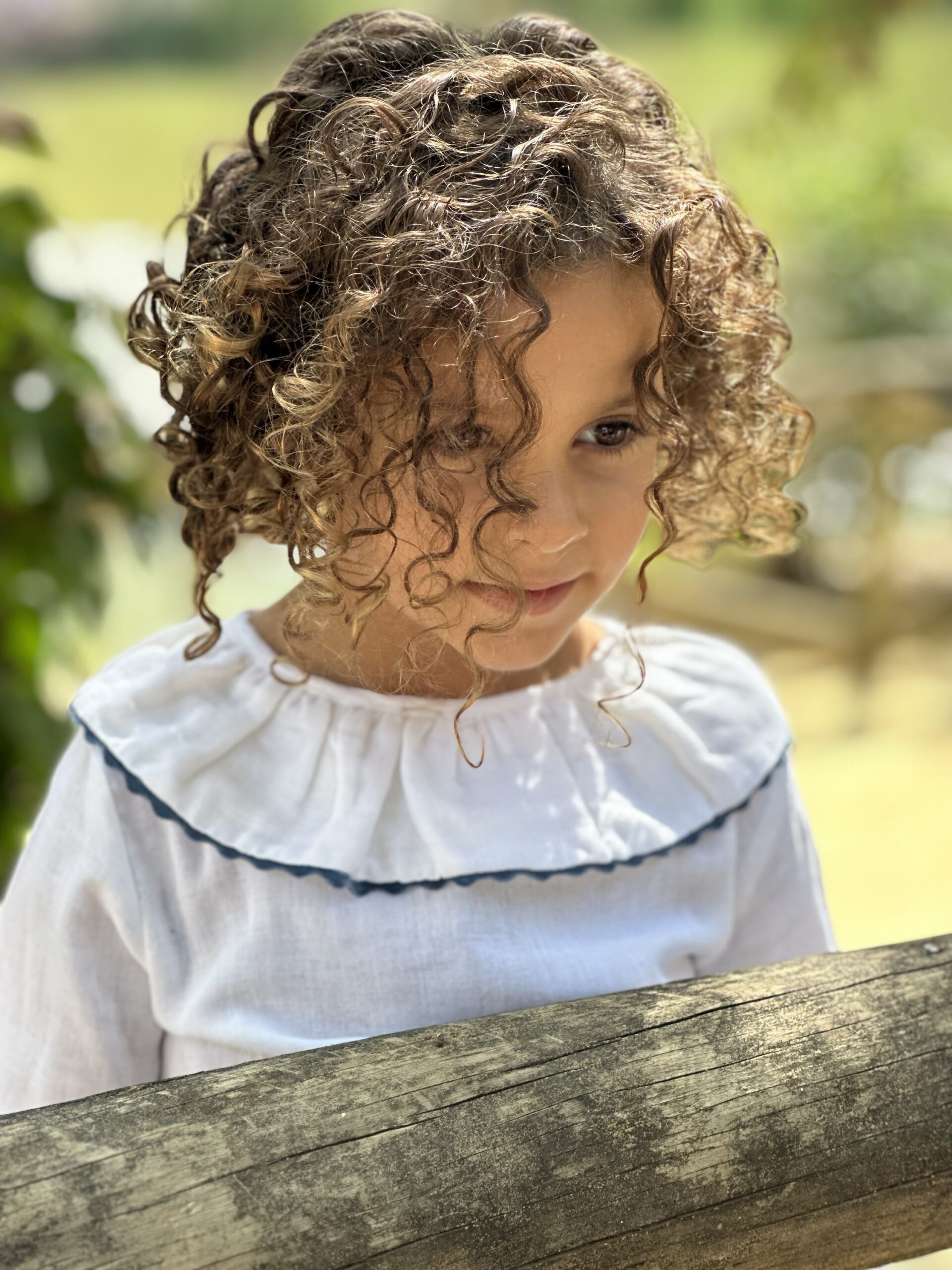 Esta blusa está confeccionada en un suave tejido de doble gasa, ideal para la delicada piel de los más pequeños. Su diseño incluye un cuello con un elegante detalle de ondulina de terciopelo azul, que añade un toque de distinción y estilo clásico. La blusa velvet ondas cuenta con botones en la parte posterior, facilitando su colocación y ajuste. Perfecta para ocasiones especiales o para un look casual chic, esta prenda es un imprescindible en el armario de cualquier pequeño con estilo.