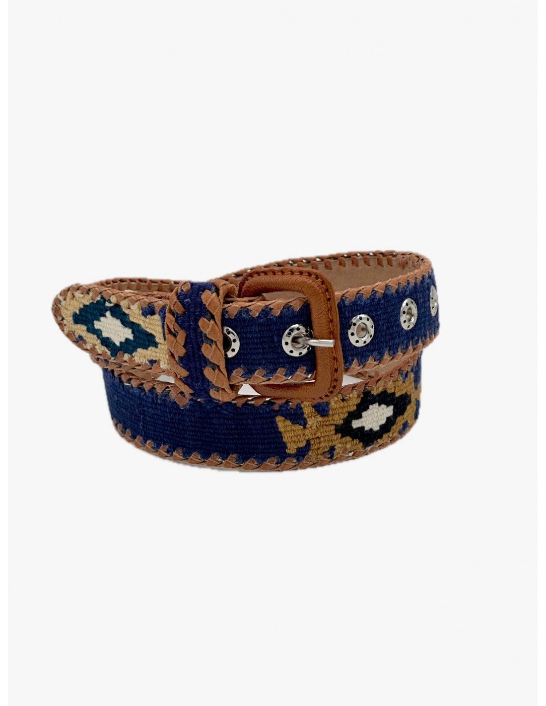 Cinturones con base de cuero y con decorados étnicos de diferentes colores trenzados con hilos de algodón. Los rombos étnicos de diferentes colores están tejidos a mano. La hebilla de metal está forrada en piel.
