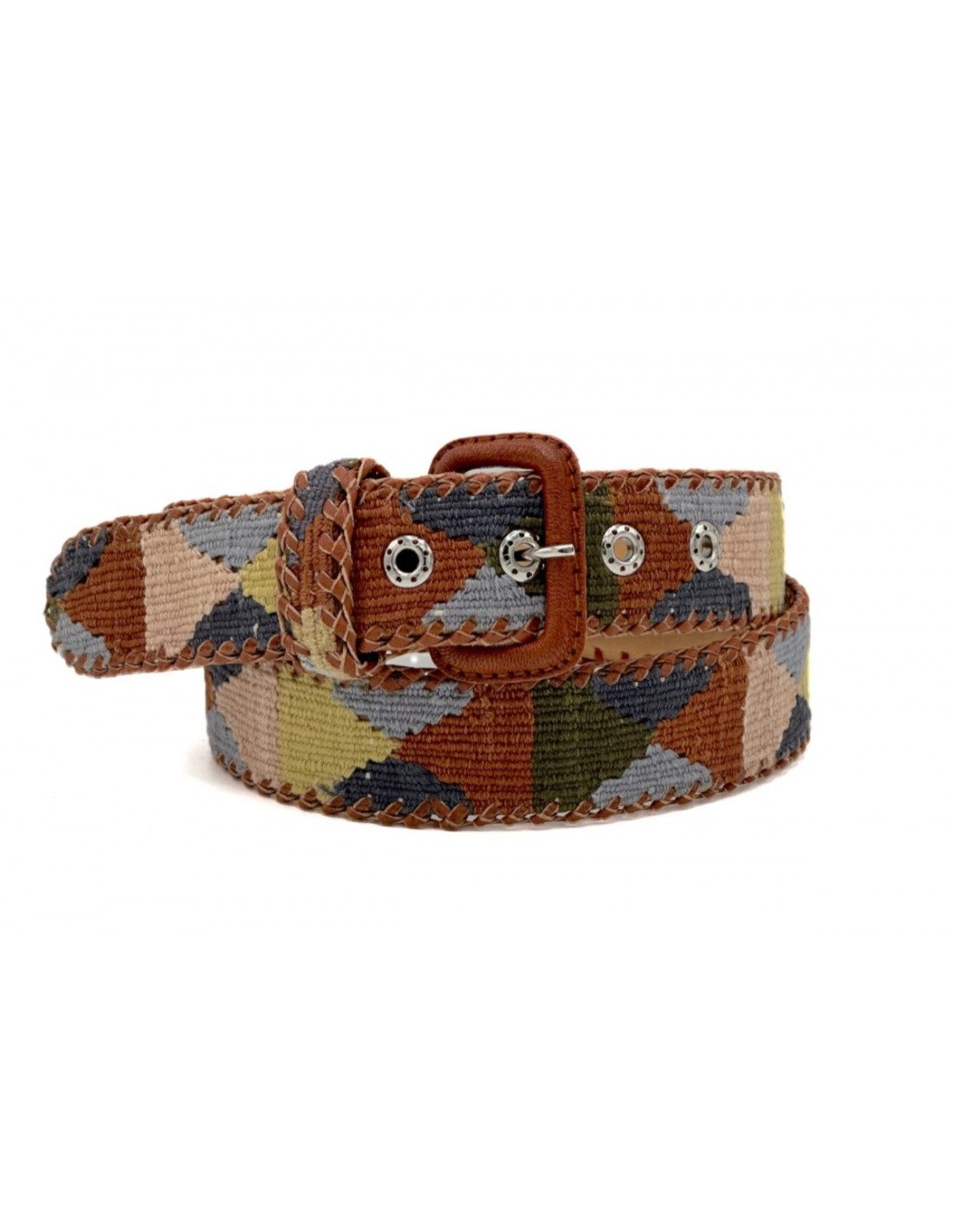 Cinturones con base de cuero, decorados con trenzados de hilos de algodón en vivos colores de estilo étnico. Los rombos, tejidos a mano con distintos tonos, aportan un toque artesanal y lleno de personalidad. La hebilla metálica viene forrada en piel para un acabado más cuidado.