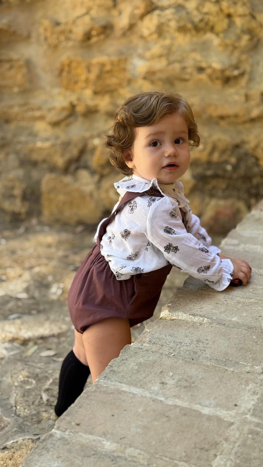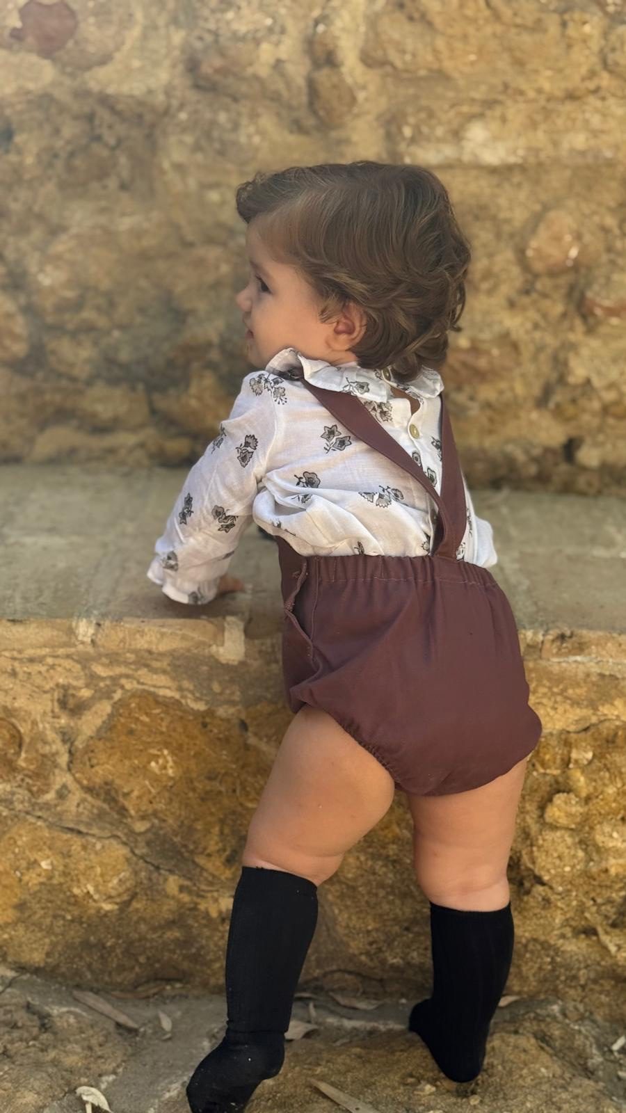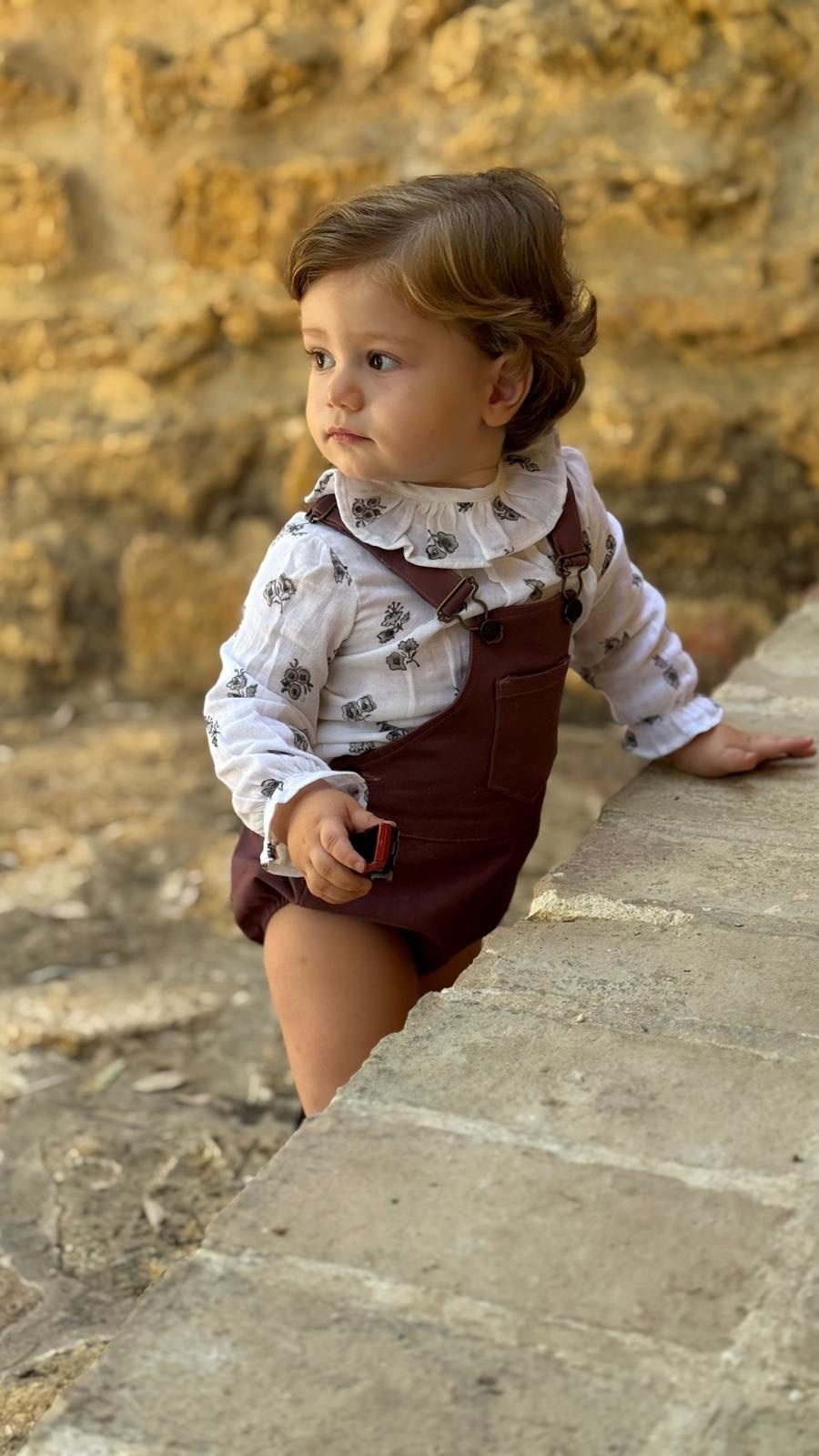 Disponible en dos tallas (2 y 3 años) y en tres colores atemporales: azul, siena y verde, este peto combina estilo y funcionalidad. Su diseño clásico con bolsillo delantero y tirantes ajustables aporta un toque moderno, mientras que la goma en las piernas asegura un ajuste cómodo para que el niño pueda jugar sin restricciones.