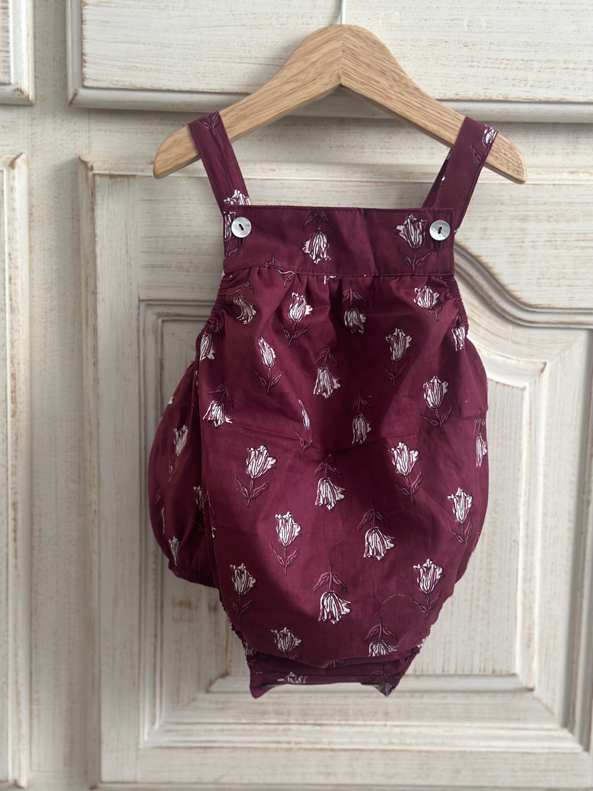 Ranita forrada, confeccionada en algodón 100% estampado manual mediante block print. El color burdeos es tendencia este otoño-invierno. La ranita Chamba combina perfectamente con el Pichi Chamba desde 2 a 5 años y con blusa Velvet Ondas con filo de terciopelo azul.